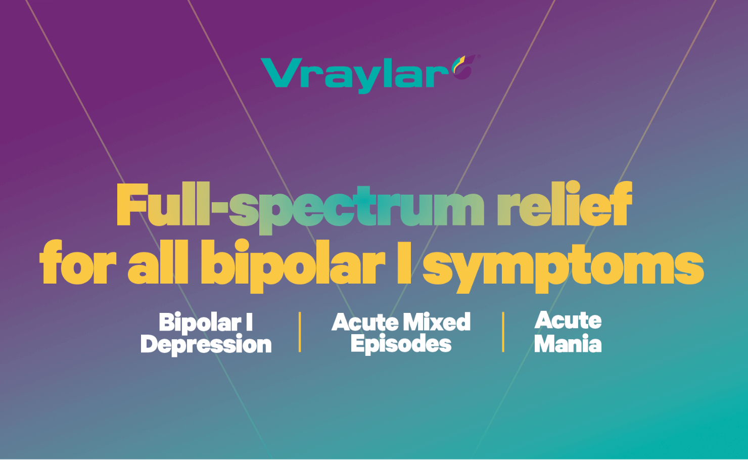 VRAYLAR is approved in adults to treat bipolar I depression and for the short-term treatment of manic or mixed episodes that happen with bipolar I disorder. While anyone can develop bipolar I disorder, it often starts in the late teen or early adult years and lasts a lifetime.